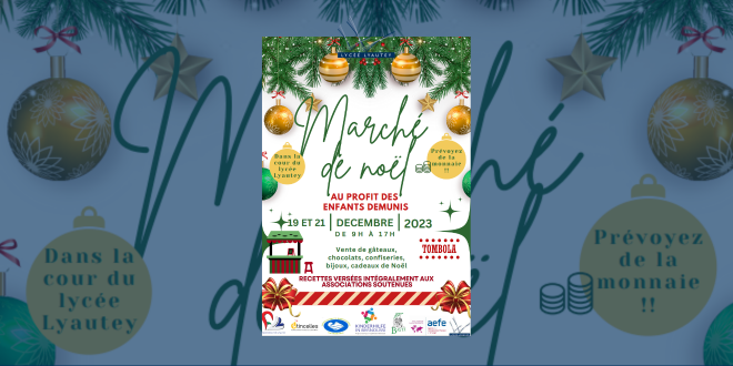 A l’occasion des fêtes de fin d’année, les élèves des ateliers solidaires ( Bayti, Étincelles et Kinderhilfe via la Fondation lycée Lyautey) sont heureux de convier les personnels et élèves au traditionnel Marché de Noël solidaire de l’établissement le mardi 19 et jeudi 21 décembre qui se déroulera à …