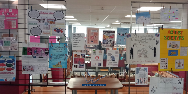 L’exposition du mois ! Ce mois de novembre ont été exposés au CDI des travaux qui appellent à la réflexion… Et pour cause, les élèves des classes de 219, 203, 211 et 212 ont travaillé avec Madame Bensaid, professeure d’anglais au lycée Lyautey autour de la thématique : combattre …