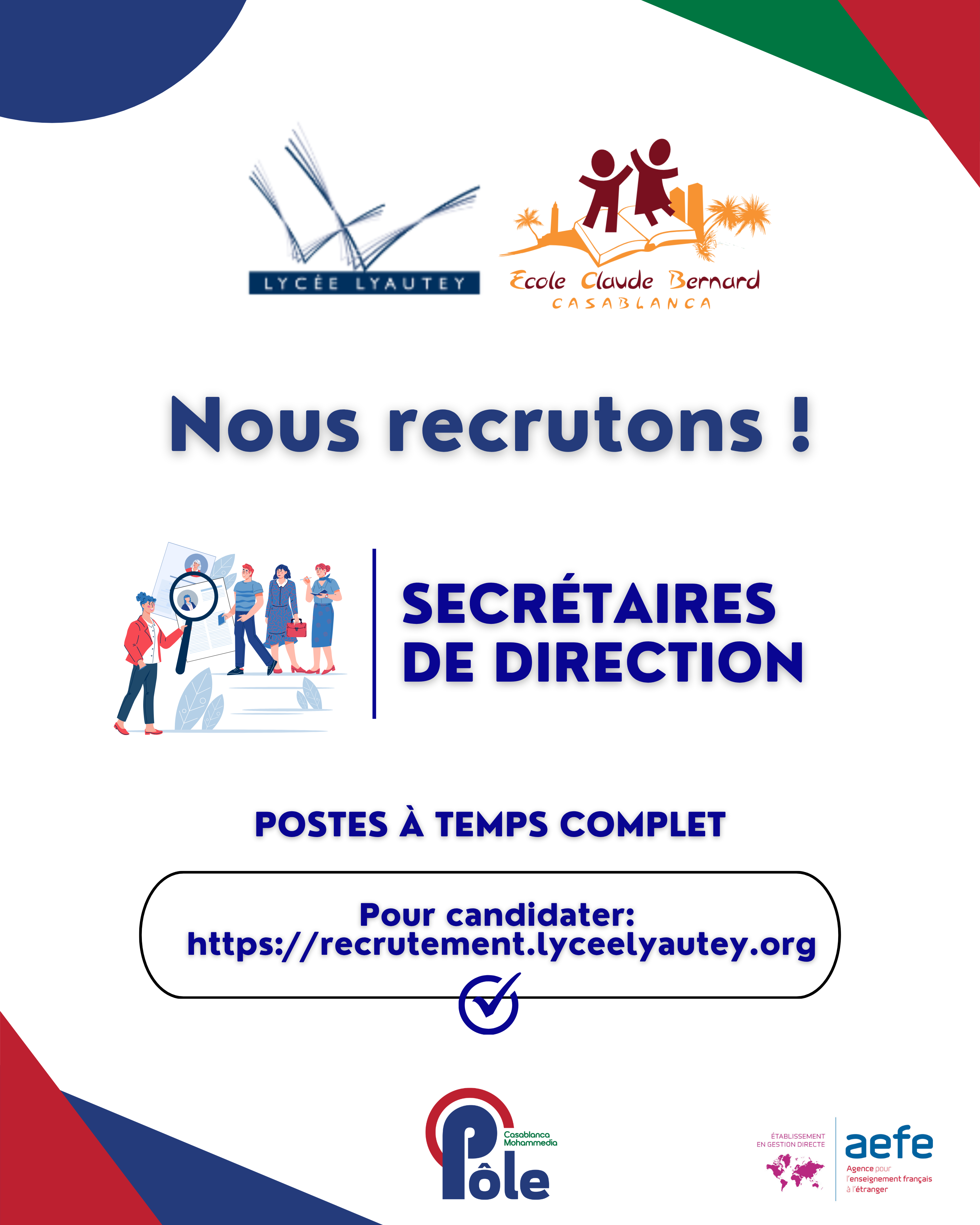 Pour en savoir plus : https://www.lyceelyautey.org/poste/secretaires-de-direction-postes-a-temps-complet-ecole-c-bernard-et-college-lyautey
