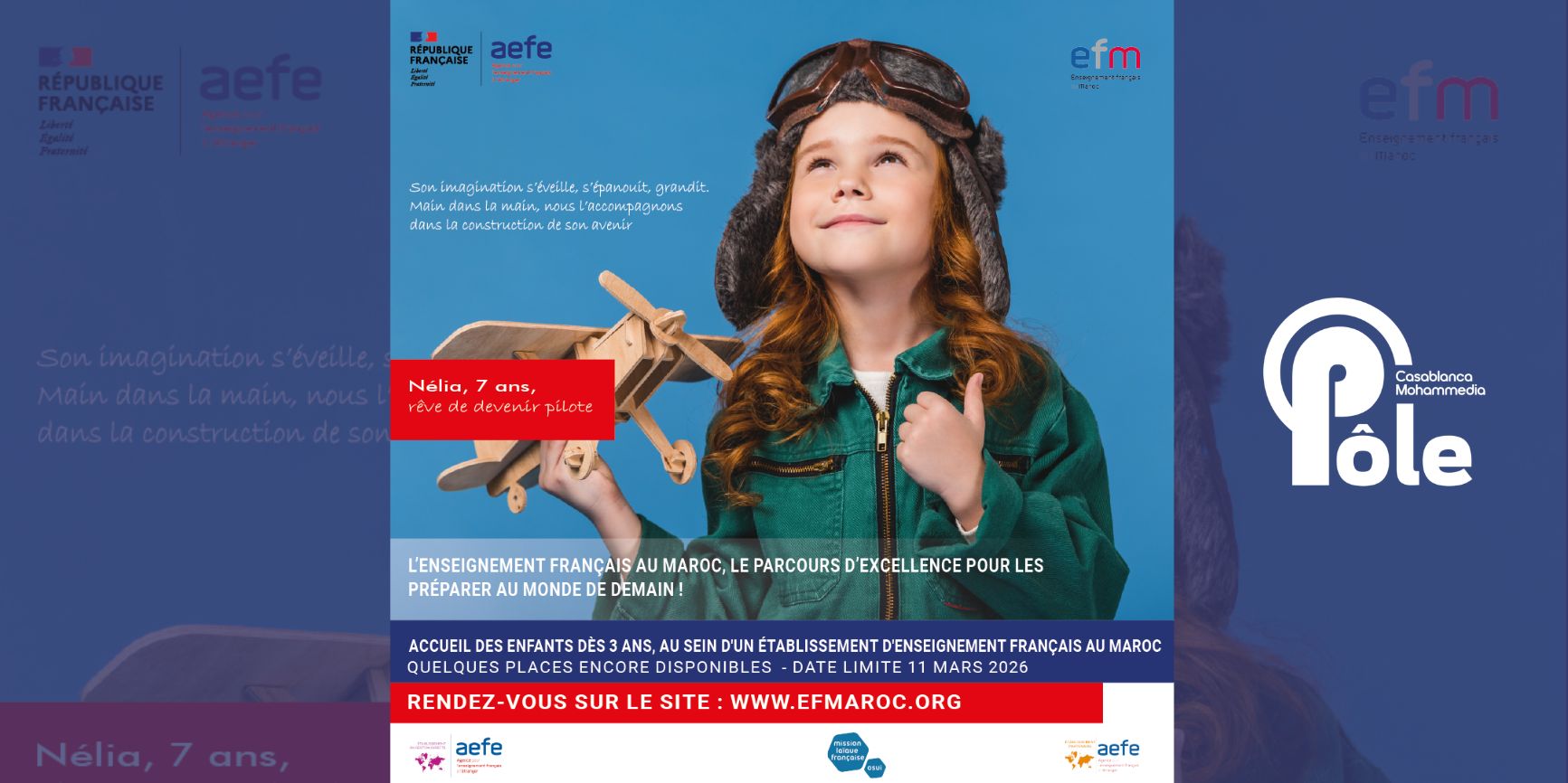 Dès aujourd’hui, nous vous invitons à rejoindre le réseau de l’enseignement français au Maroc et des établissements en gestion directe AEFE du Pôle Casablanca-Mohammedia , fort de plus de 100 ans d’expérience et reconnu pour la qualité de son enseignement, ouvert sur le monde tout en restant profondément attaché à son histoire avec le Maroc.