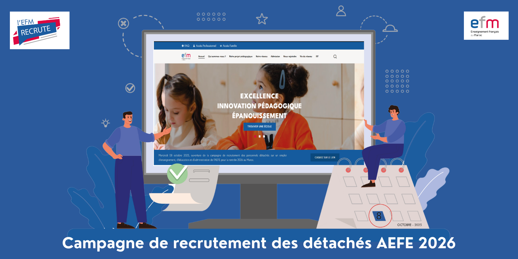 - Vous trouverez tous les détails sur le site EFM à l’adresse suivante : https://www.efmaroc.org/efm/recrutement-personnels-detaches-aefe/