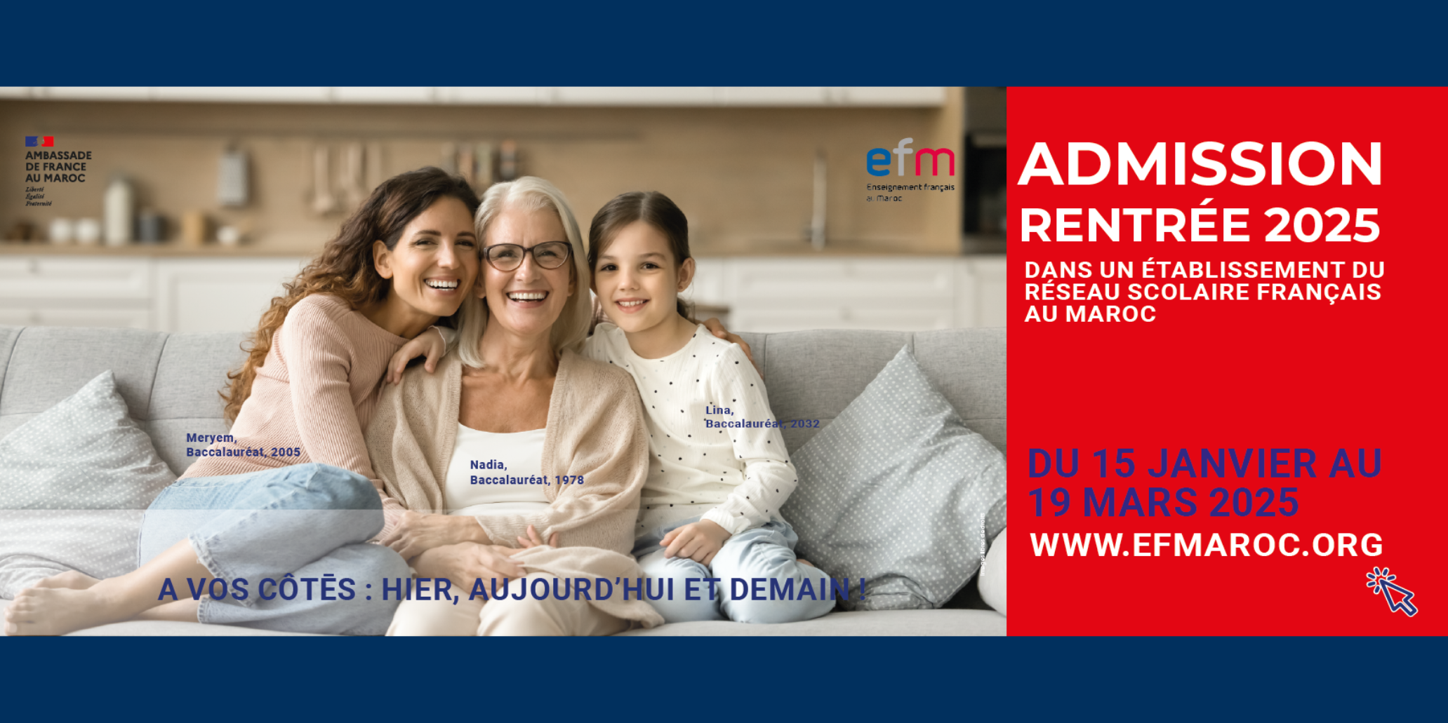 Chers parents, vous êtes désireux d’inscrire votre enfant pour la première fois au sein d’un établissement du réseau scolaire français au Maroc : la campagne des admissions pour la rentrée 2025 est ouverte à partir du mercredi 15 janvier jusqu’au 19 mars 2025.